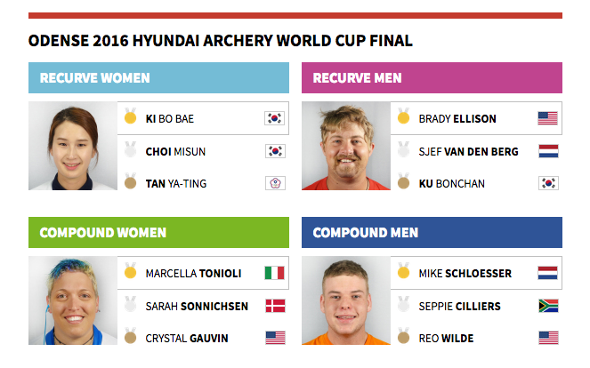 Brady Ellison’un 4'üncü defa birinci olduğu, Güney Afrikalı Seppie Cilliers ülkesinin Dünya Kupası finallerindeki ilk madalyasını kazandığı yarışmanın toplu sonuçları: